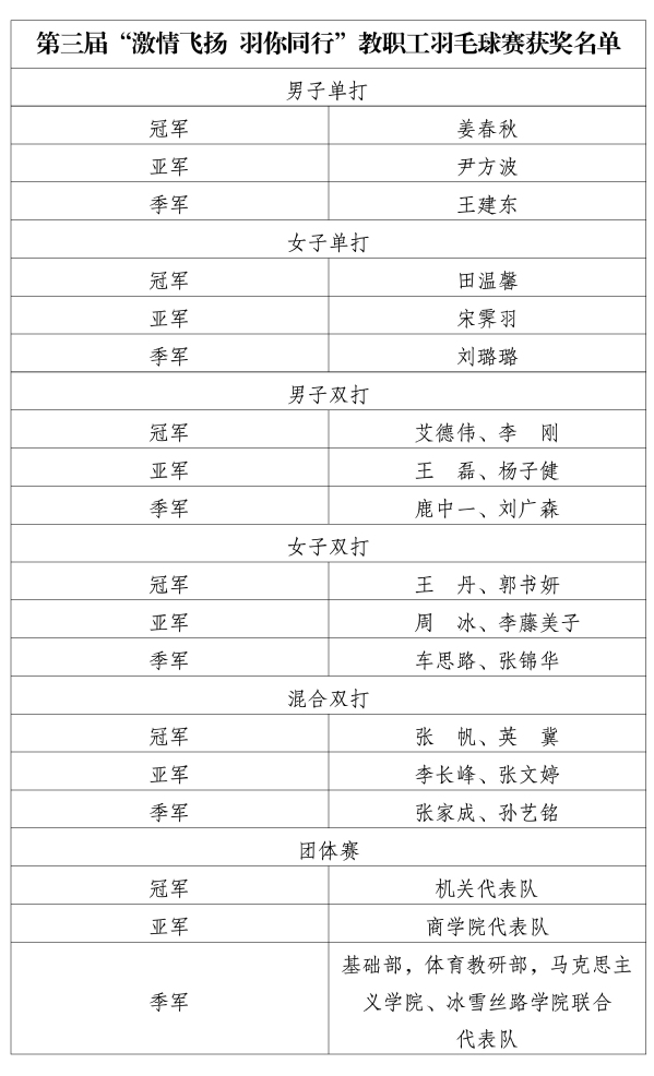 经过一场场激烈的对决,最终机关分工会代表队、商学院分工会代表队和基础部、体育教研部、马克思主义学院、冰雪丝路学院联合分工会代表队分别获得团体比赛冠、亚、季军;24名选手获得单项比赛冠、亚、季军的优异成绩。外国语/国际交流学院分工会荣获“优秀组织奖”;旅游文化学院分工会荣获“精神文明奖”。