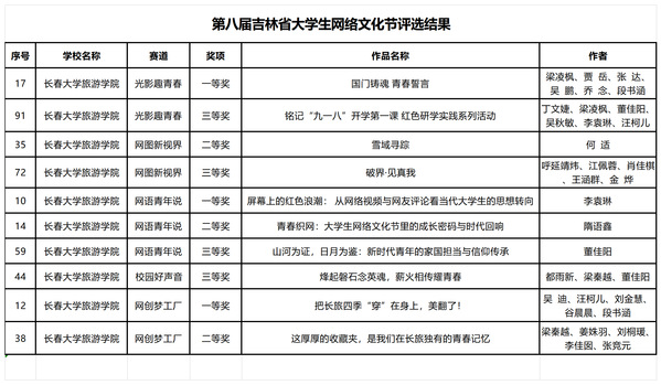 本次活动由吉林省教育厅主办,以“争做校园好网民,汇聚网络正能量,奋进强国新征程”为主题,吸引了全省各高校广泛参与,自活动开展以来共收到参赛作品1211篇。其中,吉林省大学生网络文化节共设置7个赛道,最终459件作品脱颖而出。学校高度重视此次赛事,党委宣传部第一时间牵头组织参赛各项事宜,成立专门工作组部署安排,积极组织师生参与创作。通过广泛动员、严格遴选、精心打磨等系列举措,为获奖奠定坚实基础。经过激烈角逐,长旅学子凭借鲜明的主题表达、新颖的呈现形式和深厚的情感内涵,多个作品斩获佳绩。
