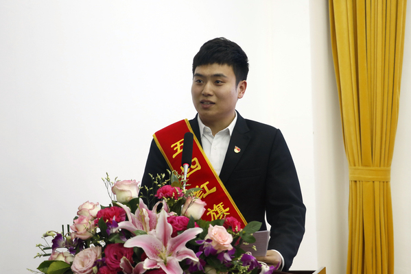 获得表彰的“五四红旗团委”商学院团委书记乔博、“十佳大学生”获得者杨龙分别在大会上进行发言。