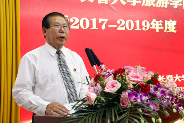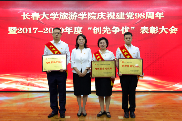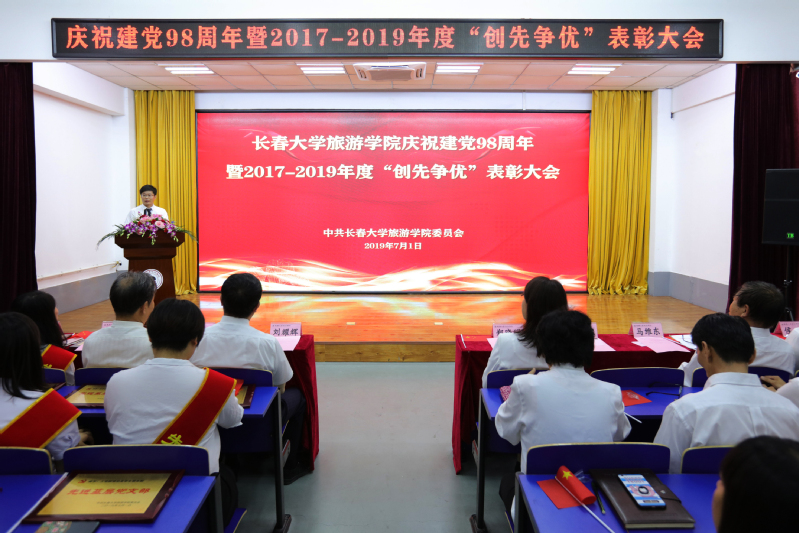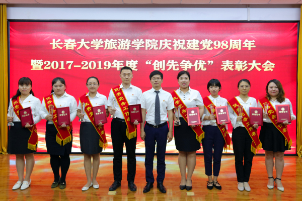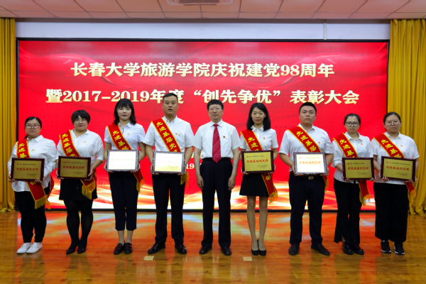 党委副书记、副校长马维东宣读《中共长春大学旅游学院委员会关于表彰2017-2019年度“创先争优”活动先进基层党组织、优秀党务工作者和优秀共产党员的决定》。3个基层党总支(直属党支部)荣获“先进基层党组织”荣誉称号;8个党支部荣获“先进基层党支部”荣誉称号;9名党务工作者荣获“优秀党务工作者”荣誉称号;44名师生党员荣获“优秀共产党员”称号。学校副董事长郑晓明、校长刘耀辉、党委书记张洪昭、副校长王玉贵分别为先进集体和个人颁发了奖牌、奖杯和证书。