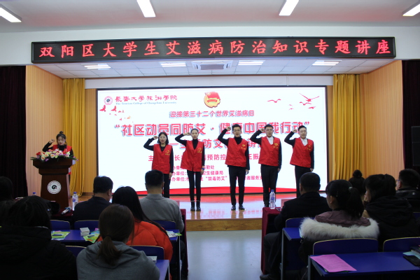 讲座在学校“禁毒防艾”宣传志愿者表演的情景剧《知艾》中拉开序幕。随后,王振宇结合实际案例对艾滋病的致病原理、发病状况、传播途径、防治措施等重点知识作了深入浅出的讲解。张丽英为“禁毒防艾”志愿者佩戴红丝带。最后,“禁毒防艾”志愿者进行宣誓。