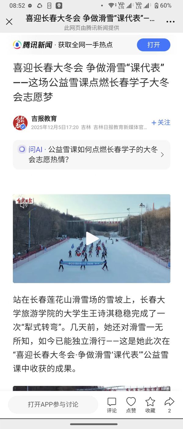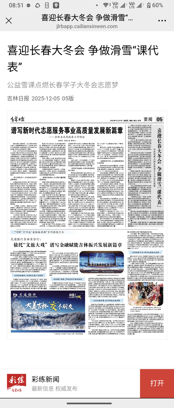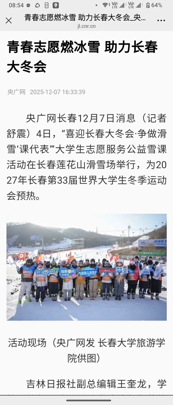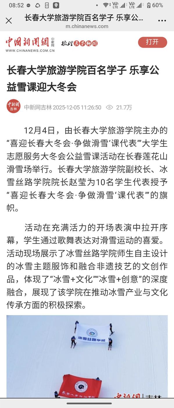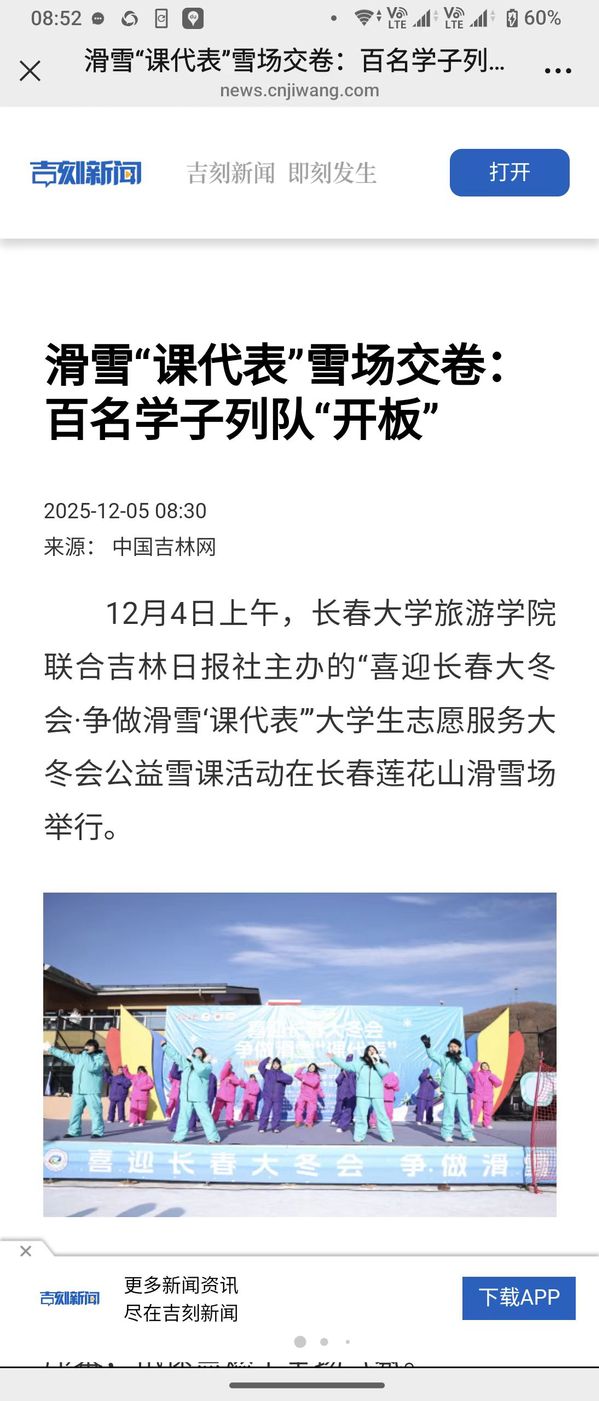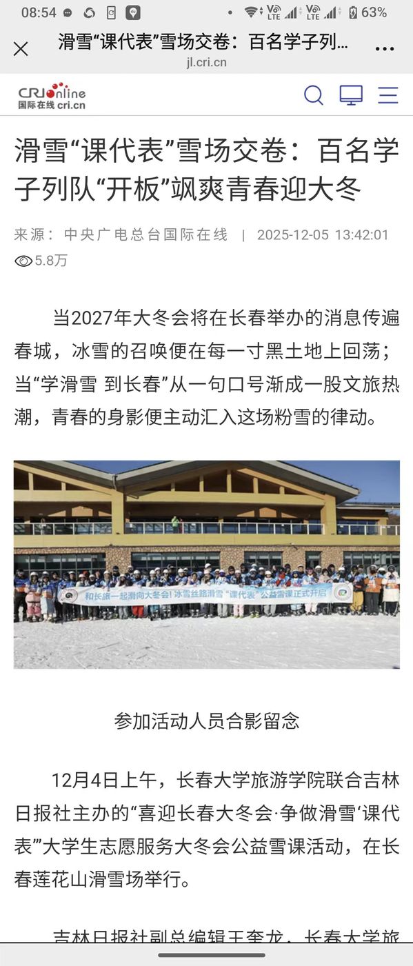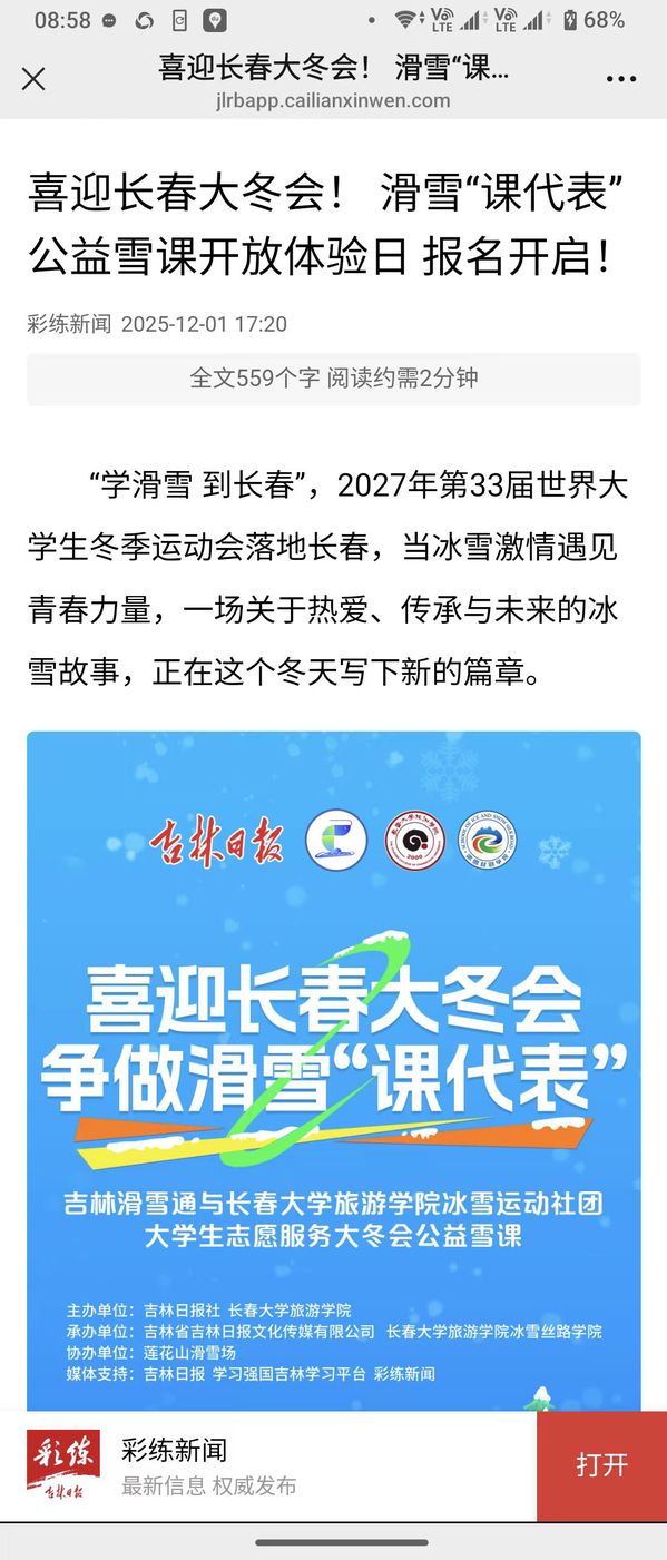12月4日,我校与吉林日报社联合举办的“喜迎长春大冬会·争做滑雪‘课代表’”大学生志愿服务大冬会公益雪课活动在莲花山滑雪场圆满落幕。冰雪丝路学院携百名学子飒爽“开板”!以青春姿态助力2027大冬会,展现了我校冰雪育人的扎实成果。
