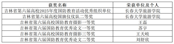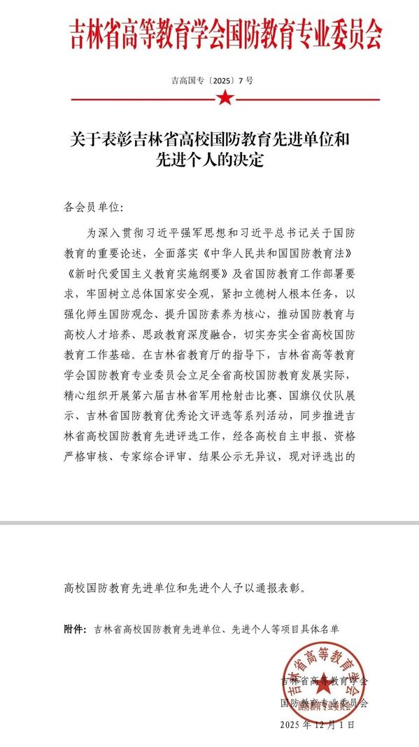 近日,吉林省高等教育学会国防教育专业委员会公布2025年度吉林省高等学校国防教育先进单位和个人评选结果。我校获评吉林省第六届高校2025年度国防教育活动优秀组织单位,荣获吉林省第六届高校国旗仪仗队二等奖。在国防教育科研论文评选中,斩获一等奖、二等奖各1项;在国防教育摄影比赛中,斩获一等奖、三等奖各1项。涵盖组织建设、理论研究、文化实践等多个领域,展现出我校国防教育工作的优秀成果。