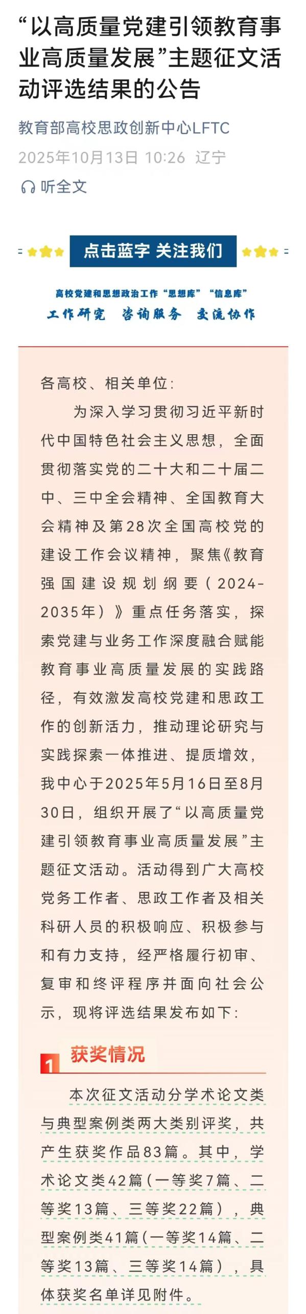 近日,由教育部高校思想政治工作创新发展中心主办的2025年度“以高质量党建引领教育事业高质量发展”主题征文活动结果正式揭晓,我校申报的典型案例《党建引领育人“旅”程——长春大学旅游学院“党建+”赋能应用型人才培养的生动实践》,历经多轮严格评选,最终荣获典型案例类二等奖,实现了学校党建工作综合类成果新突破,标志着学校长期以来,坚持以高质量党建引领高质量发展的经验作法得到了更高水平的认可。