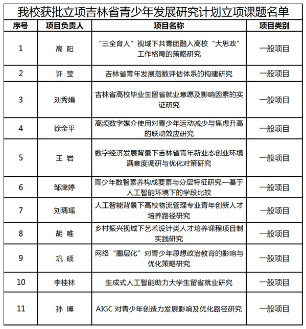 近日,共青团吉林省委员会正式公布《2025年度吉林省青少年发展研究计划课题立项名单》,我校共有11项课题成功获批,立项数量与质量均体现出学校在青少年发展领域研究的扎实基础与鲜明特色。