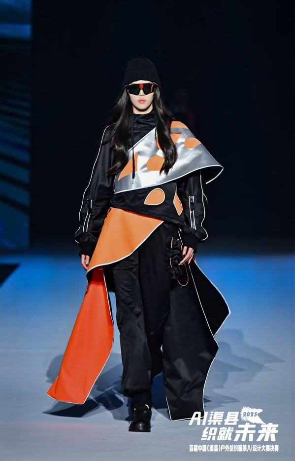 本次参赛户外装系列作品《暮熔星序》灵感撷取自紫禁城建筑的飞檐翘角。设计将传统的建筑语言转译为现代的服装符号,肩部轮廓与斗篷式衣身,复现了屋檐的磅礴气势,由不规则三角形衣片拼接而成的下摆,象征着层叠的鳞瓦,衣身的激光切割图案,提炼自古典窗棂的几何美学。而立体的圆锥形结构,则抽象化再现了檐角的图案饰物,于方寸间尽显建筑精魂。