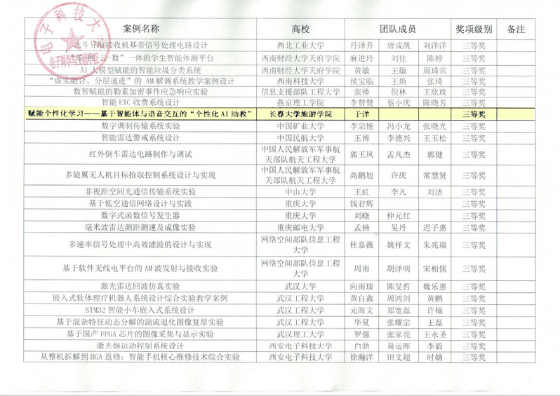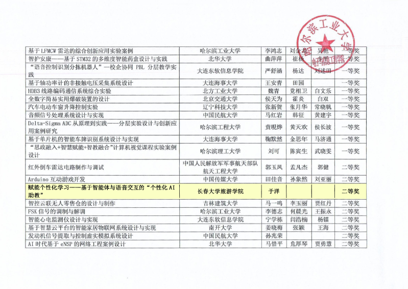 本届竞赛由教育部高等学校电子信息类专业教学指导委员会、国家级实验教学示范中心联席会电子学科组和中国电子教育学会等联合主办,分为北部、东部、西部、中南部四个赛区,全国超百所高校的612项案例报名初赛,235项案例入围总决赛。二位教师的案例,聚焦教育数字化转型需求,注重构建“问题导向-目标拆解-能力培养”的三阶教学模型,实现了“教-学-评”全流程智能化。于洋老师的案例在北部赛区(哈尔滨工业大学承办)中获北部赛区二等奖并晋级全国决赛,并最终在电子科技大学举行的全国总决赛中斩获三等奖。