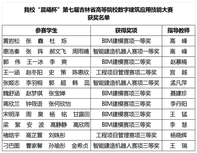 11月15日,“晨曦杯”第七届吉林省高等院校数字建筑应用技能大赛在吉林建筑科技学院圆满落幕。我校工学院工程造价、工程管理专业共派出42名学生组成12支队伍参赛,最终荣获一等奖2项、二等奖3项、三等奖6项,累计斩获11项省级奖项,以92%的获奖率在全省高校中表现突出,充分展现了学校“以赛促学、以赛促教”的育人成效及OBE教学改革成果。
