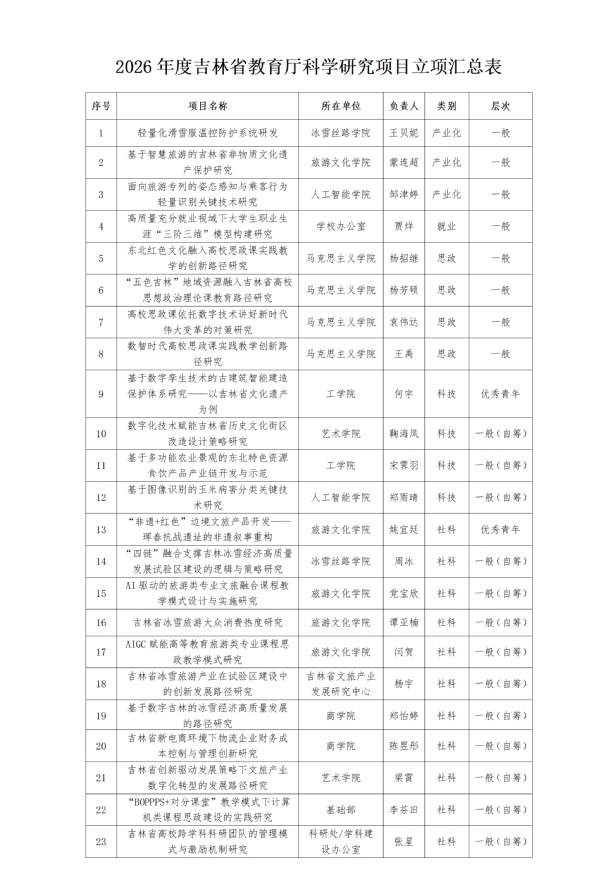近日,2026年度吉林省教育厅科学研究项目立项名单正式公布。经教师自主申报、学校初审推荐、省教育厅组织专家评审等多轮严格遴选,我校共有23项课题成功获批。