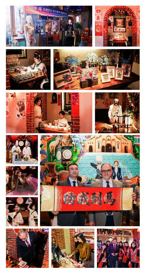 本次年会不仅是经贸合作的对话场,更是文明互鉴的展示舞台。年会由学校上合专项实训实验班承办,活动现场,实验班师生为到场嘉宾献上了一系列兼具中国民族特色、融合中俄两国文化元素的互动环节和精彩文艺表演。“东北亚长旅号”沉浸式打卡区留下新年祝福;吉林名菜锅包肉、雪衣豆沙的现场制作,引得中外嘉宾连连称赞;“非遗展示体验区”内,学员们精湛的剪纸、茶道、书法及缠花技艺,让来宾沉浸式体验到了中华优秀传统文化魅力;热情奔放的新疆克尔克孜民族歌舞、古典江南舞与黑土地风情的舞蹈《大东北就是我的家乡》交相辉映,生动诠释了“各美其美,美美与共”的文明对话图景,深深感染了在场每位嘉宾,精彩的演绎赢得现场阵阵热烈掌声。从方案落地到细节执行,同学们的全情投入与周密筹备,向中外宾朋展现了长旅学子的专业素养、协作能力、责任担当,得到了与会领导、现场嘉宾的高度认可和广泛赞誉。