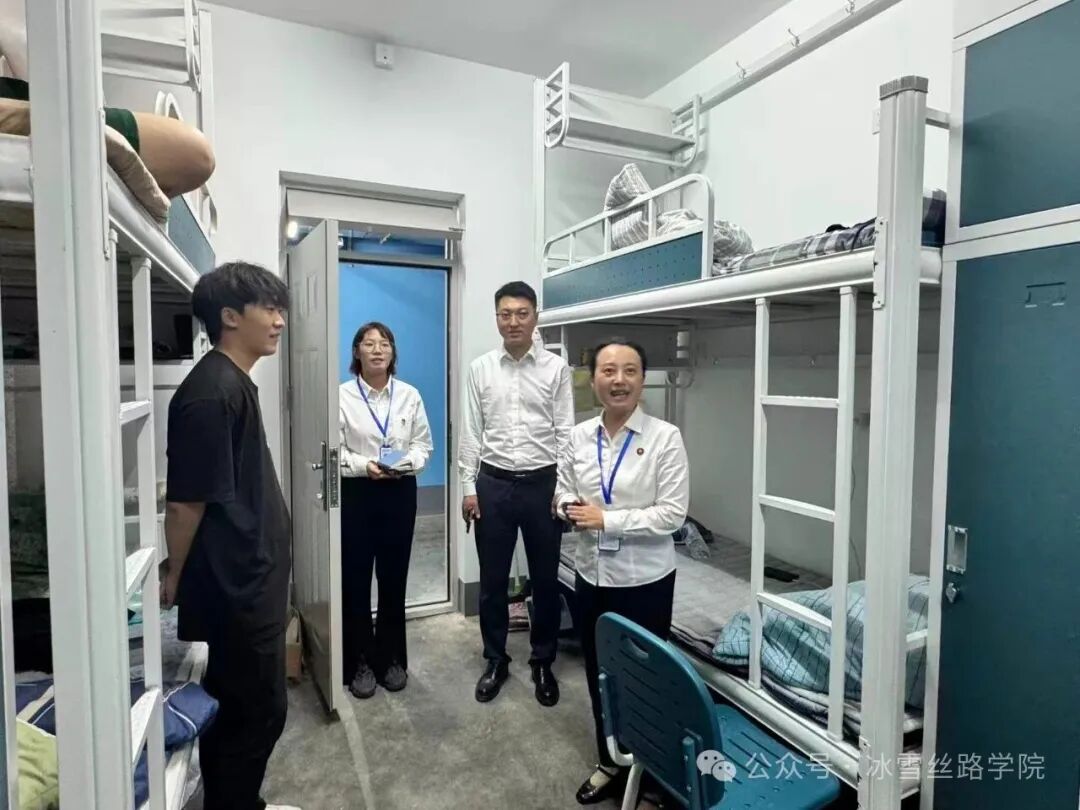 8月31日新生见面会圆满结束后,夜色渐浓的校园里仍暖意涌动。副校长兼冰雪丝路学院院长赵莹,学院党总支副书记孙继龙,新生辅导员刘磊一行专程来到学生公寓,深入2025级新生寝室走访慰问,为刚踏入校园的学子们送去关怀与嘱托。