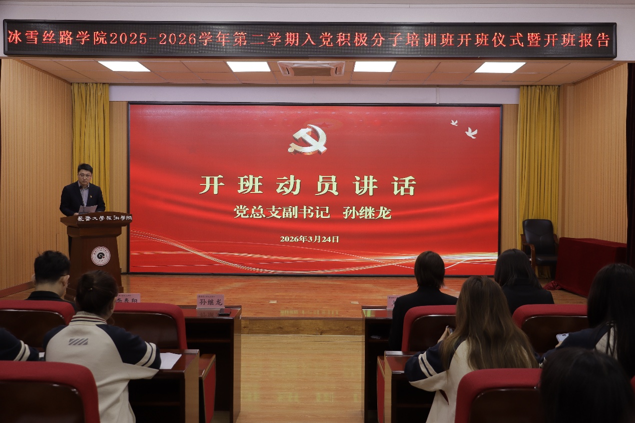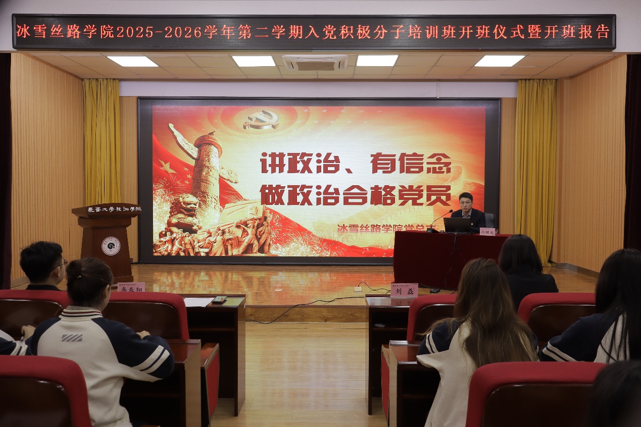 为持续加强入党积极分子思想政治建设,夯实党组织后备力量根基,引导青年学子坚定理想信念、立足专业勇担使命,3月24日,冰雪丝路学院2025-2026学年第二学期入党积极分子培训班开班仪式暨开班报告顺利举行。学院党总支副书记孙继龙、团委副书记王雪、辅导员李春阳及本期全体入党积极分子参加活动,仪式由学生党支部书记刘磊主持。
