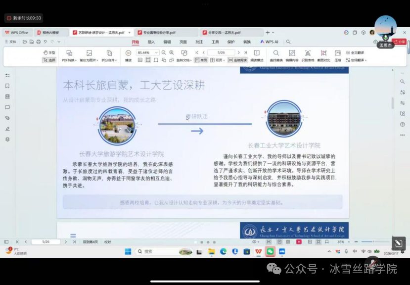 2026年3月17日,冰雪丝路学院立志成才“第一课”——创新创业主题线上分享会顺利举办。本次活动特邀学院2024届优秀校友、长春工业大学在读研究生孟思杰担任主讲嘉宾,学院各年级在校生齐聚线上腾讯会议,共学双创备赛技巧,探索专业与双创融合发展之路。