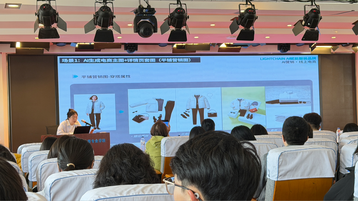 本次培训围绕“AI赋能·增效降本”主题,设置了三个核心模块,首先系统讲解了人工智能如何从设计、生产到营销等环节推动传统服装行业转型升级,实现降本增效;其次聚焦轻链AI平台在款式生成、面料匹配与趋势预测中的实际应用,剖析智能生成技术带来的产业新机遇;最后通过鲸绘AI平台开展服装可视化实战课,师生现场实操体验AI在效果图绘制、虚拟试衣及视觉呈现中的高效能力,进一步加深了对AI辅助设计的理解。