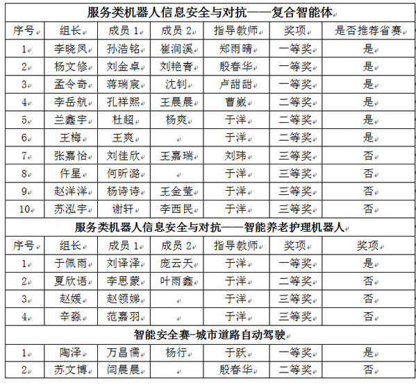 本次赛事由人工智能专业于跃老师和尹航老师担任裁判,来自人工智能学院的17 组参赛队伍围绕自动驾驶信息安全与对抗 —— 城市道路自动驾驶、服务类机器人信息安全与对抗 —— 智能养老护理机器人、服务类机器人信息安全与对抗 —— 复合智能体等赛道展开激烈角逐,集中展现了信息安全与对抗技术领域的创新成果与实践实力。获奖名单公布如下: