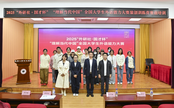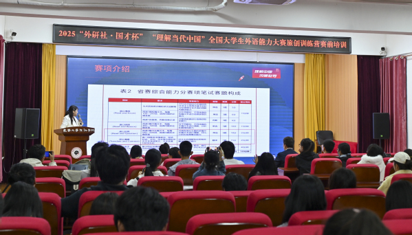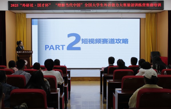 培训伊始,赛事总负责人许可新宣读校赛通知并致辞。他指出,“外研社·国才杯”“理解当代中国”全国大学生外语能力大赛是教育部认可的全国性竞赛,连续多年入选《全国普通高校大学生竞赛分析报告》目录,是高校重点支持的学科竞赛。大赛以价值引领为核心,坚持理念创新,不仅为青年学子搭建了展示才华、追逐梦想的平台,更助力推动高校外语教育改革,着力培养兼具家国情怀、能讲好中国故事、传播中国声音的高素质国际化人才。