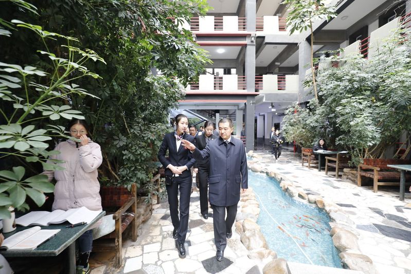 于洪岩副部长一行人还参观了我校旅游专业校内实训基地,我校2014级旅游管理专业学生担任讲解员,向各位领导展示我校独具特色的室内景观带,展现了我校应用型人才培养的实力,得到了领导的好评。最后,于洪岩部长一行参观我校室内活动场所-羽毛球场,并在羽毛球场合影留念。