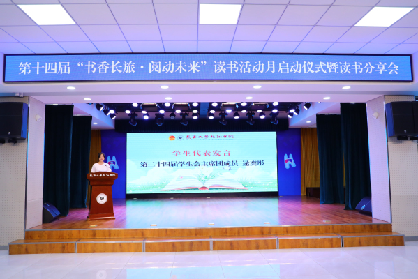 校学生会主席团成员逯奕彤代表全体同学作表态发言。她表示,将积极参与读书活动月的各项活动,大力宣传动员广大青年学生参与到活动中来,实现阅读价值,为营造书香校园贡献青春力量。