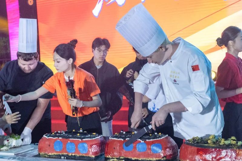 第一篇章“缘起·相聚长旅”以温情与归属为主线,传递团圆、欢庆与欢迎新生的浓浓情谊。《月下鱼游·梦“旅”华章》等节目演绎团圆相聚的暖意;校友深情献唱重温母校岁月,辅导员用旋律传递陪伴与守护的温情承诺。温馨氛围在“东北亚长旅号”的甜蜜派送中达到高潮,托尔斯泰厨房主厨惊喜现身,带来特制蛋糕和俄式烤乳猪,为现场2025级“小寿星”送来甜蜜祝福。适逢学校领导受邀参加俄罗斯圣彼得堡国立经济大学95周年校庆活动,现场通过大屏为师生送来了校庆活动实况,将学校国际化办学理念化为一份可感可触的温暖,更凝聚起全体新生融入长旅、共筑梦想的归属之情。