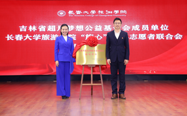 张超凡和学校团委书记张帆共同为吉林省超凡梦想公益基金会成员单位——“旅心”青年志愿者联合会揭牌