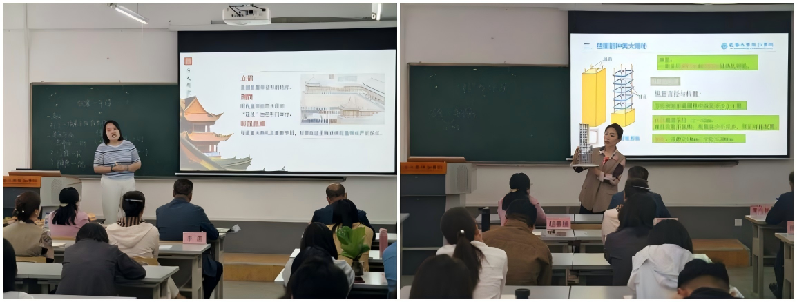 活动分为新入职教师微课展示、骨干教师微课示范及专家点评三个环节。三位新入职教师分别就《轻型钢结构》《植物的根系》及《基础插筋长度计算》教学内容进行现场展示,创新融合数字动画、教具模拟与情景互动,呈现了生动有趣的微课教学。两位骨干教师则通过《中国古建筑设计》与《建筑结构》示范课,运用沉浸式教具演示与互动式教学,展现了优秀板书设计对教学质量提升的关键作用,为全场教师树立了学习标杆。