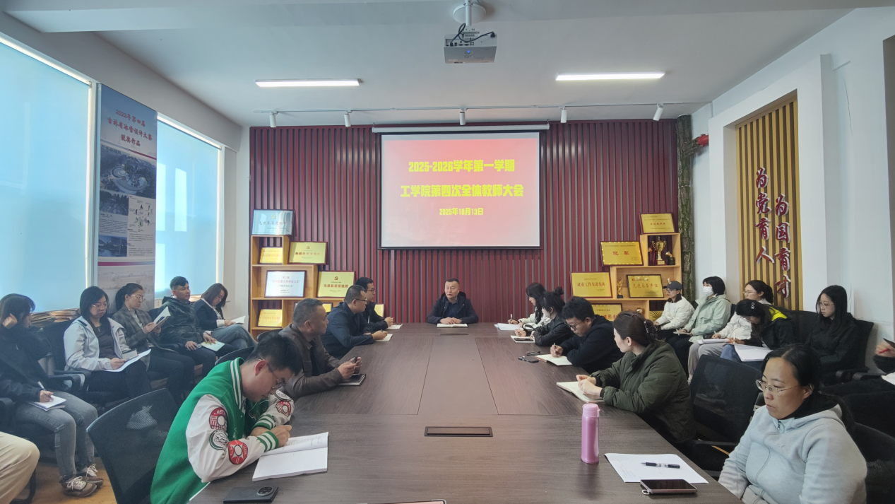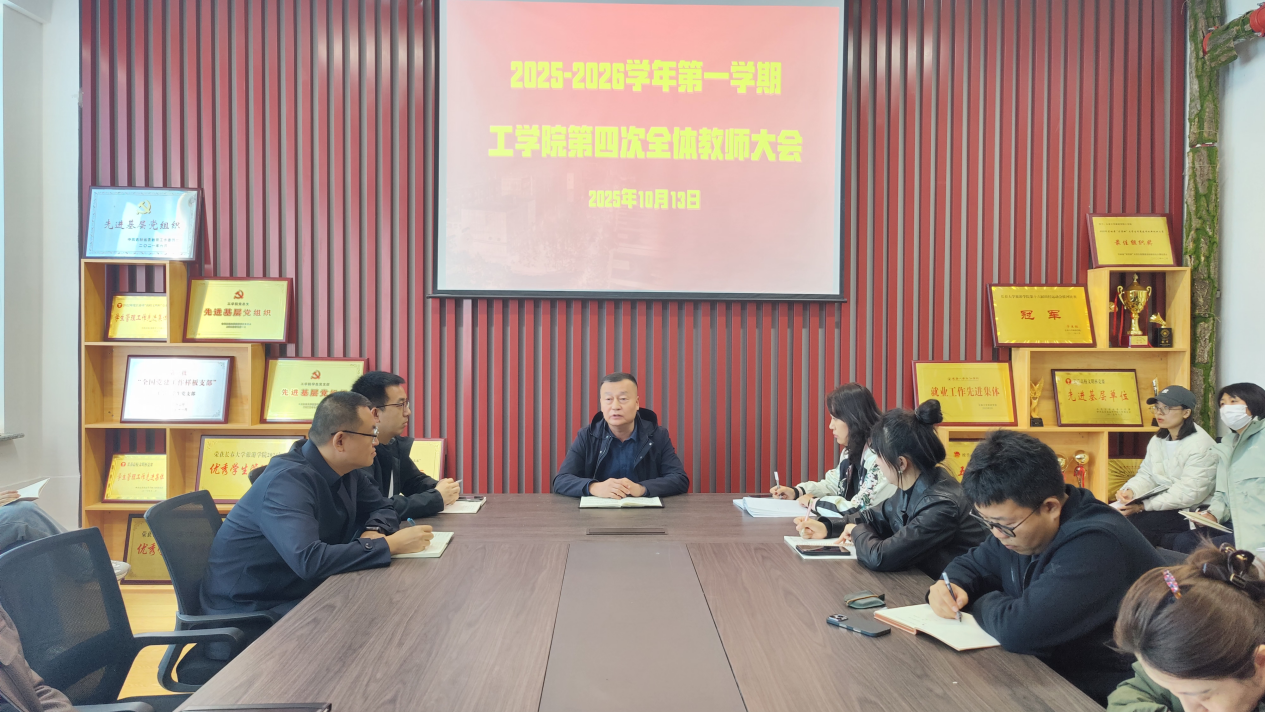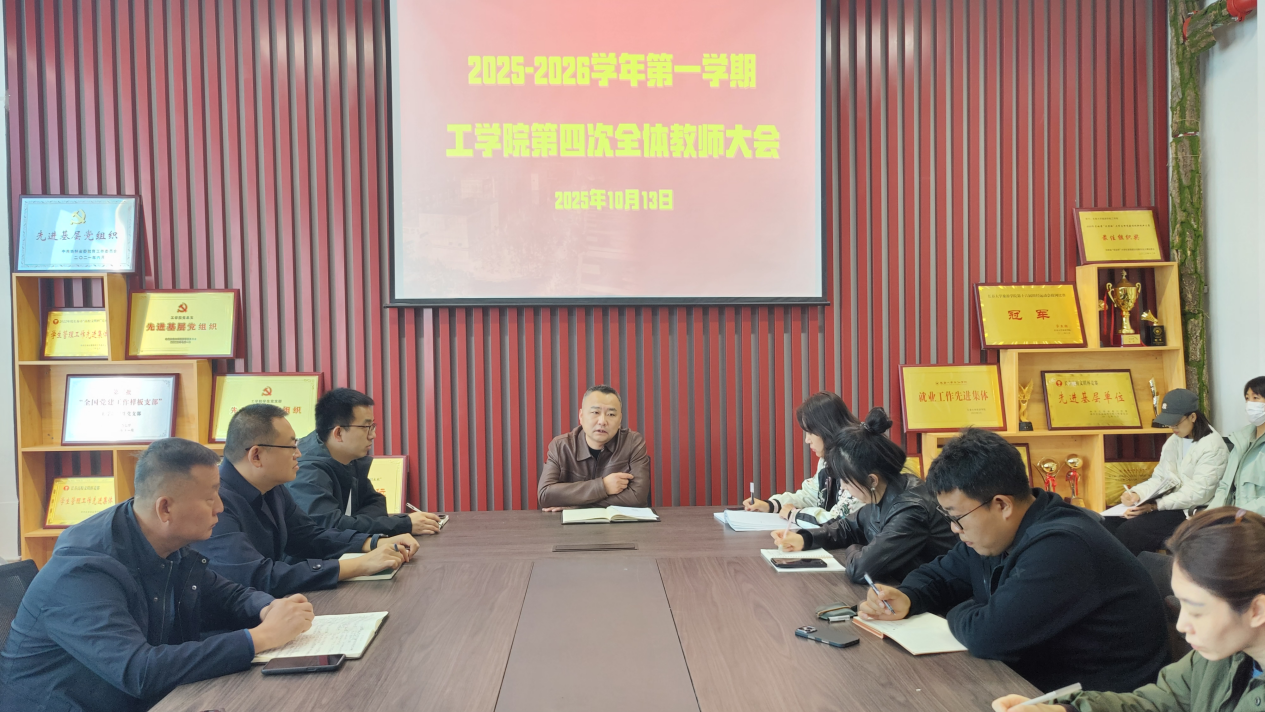 10月13日,工学院召开第四次全体教师大会,聚焦理论学习、学生培养、专业建设、教学管理等核心议题,明确以“改革创新、提质增效”为主线,全面推进学院各项事业高质量发展。会议由院长高峰主持,党总支书记仇岩、副院长董峻岩及全体教职工参会。
