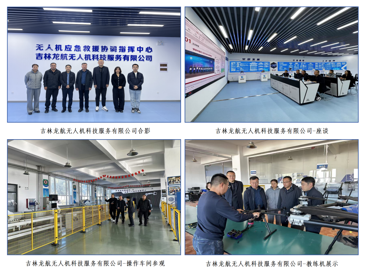 本次调研先后走访了吉林龙航无人机科技服务有限公司、吉林省彬生蓝航天际无人机科技有限公司、吉林省弘溢人力资源服务有限公司、吉林省翼启飞科技有限公司四家行业领军企业。