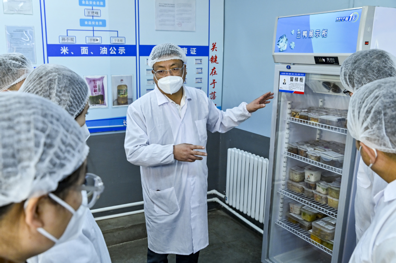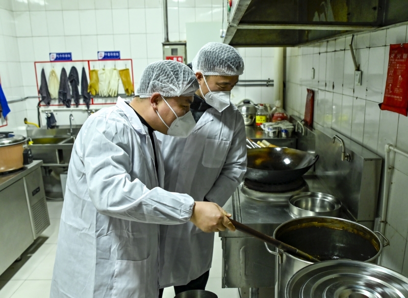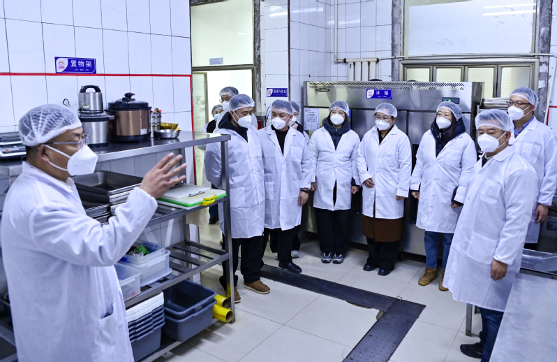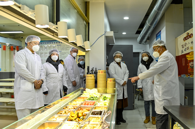在后勤服务中心负责人及食堂管理人员的引导下,检查人员严格遵守食品卫生规范,同意穿戴白大褂、佩戴一次性口罩,依次进入了前厅就餐区、后厨加工区、食材储存区及餐具消毒区等关键区域。在就餐区,检查人员细致检查餐桌椅清洁度、通风设施运行及文明标识设置情况;在后厨加工区,重点了解食材切配流程、烹饪操作规范及工作人员健康管理要求;在储存区,逐一核查米、面、油等食材的采购凭证、保质期及分类存放情况;在消毒区,现场巡视餐具清洗、高温消毒、烘干存放全流程,对食堂“明厨亮灶”制度及规范化管理给予充分肯定。