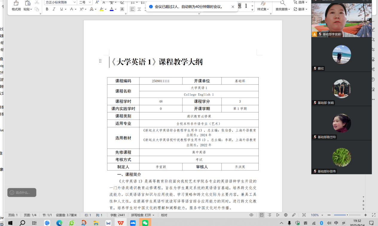 为统筹推进新学期课程教学工作,9月14日,大学英语 B 级课程组以腾讯会议形式召开外聘教师教学工作会议。课程组带头人李宣颖主持会议,五名承担艺术类、专科及专升本教学任务的外聘教师参会。