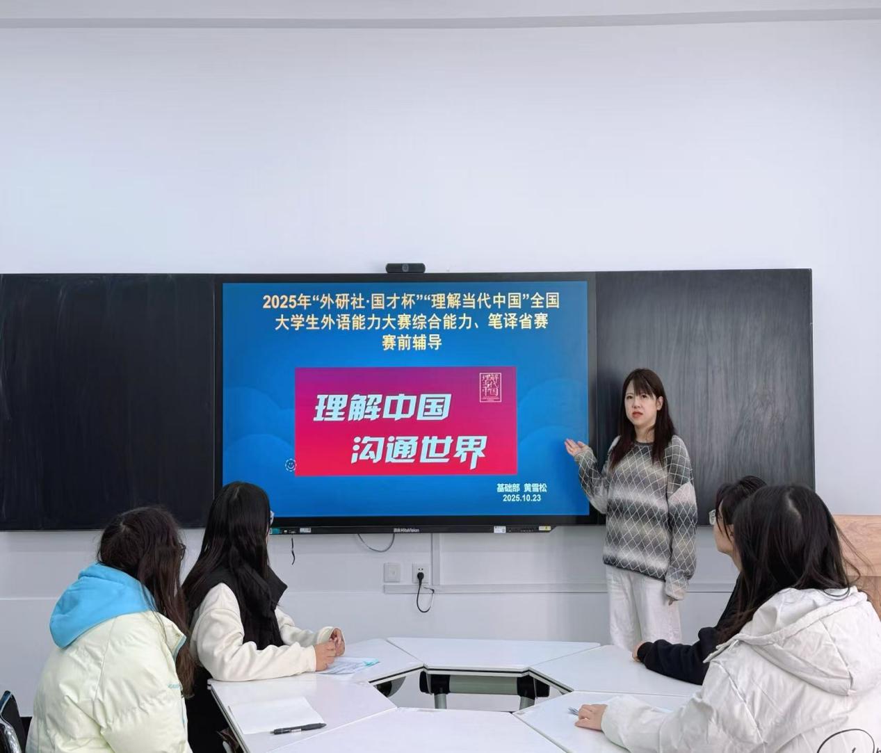 为帮助我校入围2025年“外研社∙国才杯”“理解当代中国”外语能力大赛综合能力、笔译赛项省级决赛的学生们充分备赛,基础部于10月23日在101教室开展了赛前辅导活动。本次辅导由基础部黄雪松老师主持,参加本次辅导的学生分别是商学院学生谷晨晨、旅游文化学院学生崔佳情、工学院学生董俊葶和人工智能学院学生栗雪冰。
