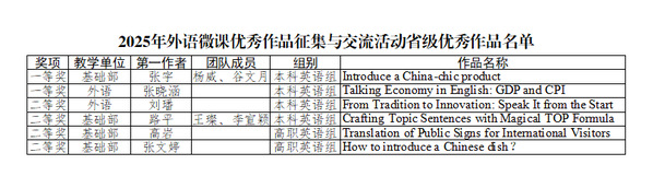 近日,2025年外语微课优秀作品征集与交流活动省级评审结果正式公布。我校教师荣获一等奖2项,二等奖4项。