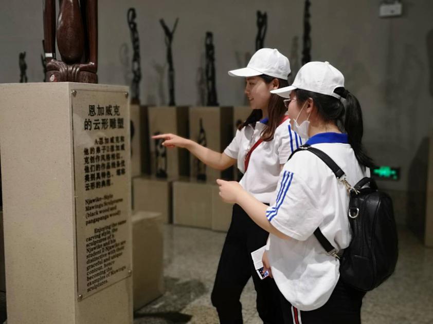 图为学生在雕塑公园内的松山韩蓉非洲艺术收藏馆认真学习