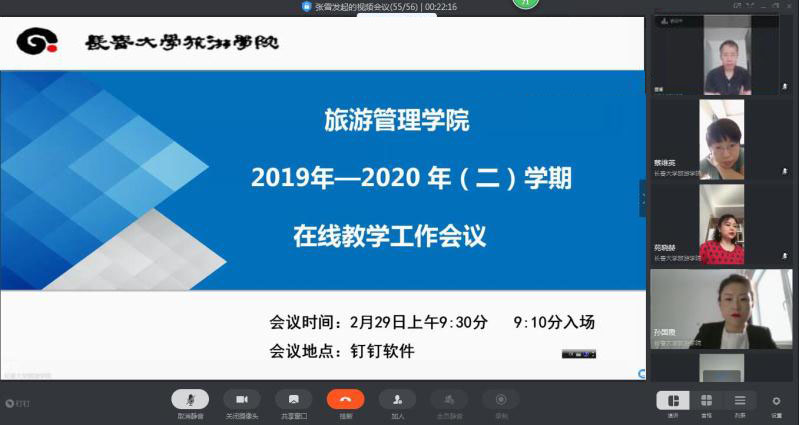 2020年2月29日上午9:30旅游管理学院在钉钉软件召开2019-2020学年第二学期在线教学工作视频会议。旅游管理学院全体专职教师、外聘教师,全体辅导员共56人全部参会。会议由旅游管理学院办公室主任王伟光主持。
