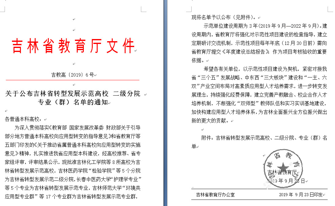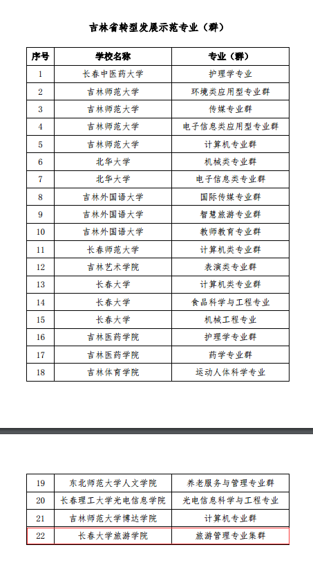 旅游管理专业集群转型示范——从2019年5月开始组织申报,到6月底上交申报材料,经高校推荐、省专家组评审、评审结果公示等环节,2019年9月旅游管理专业集群被吉林省教育厅评定为“吉林省转型发展示范专业(群)”。