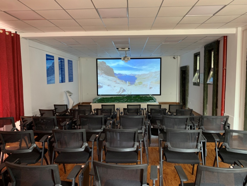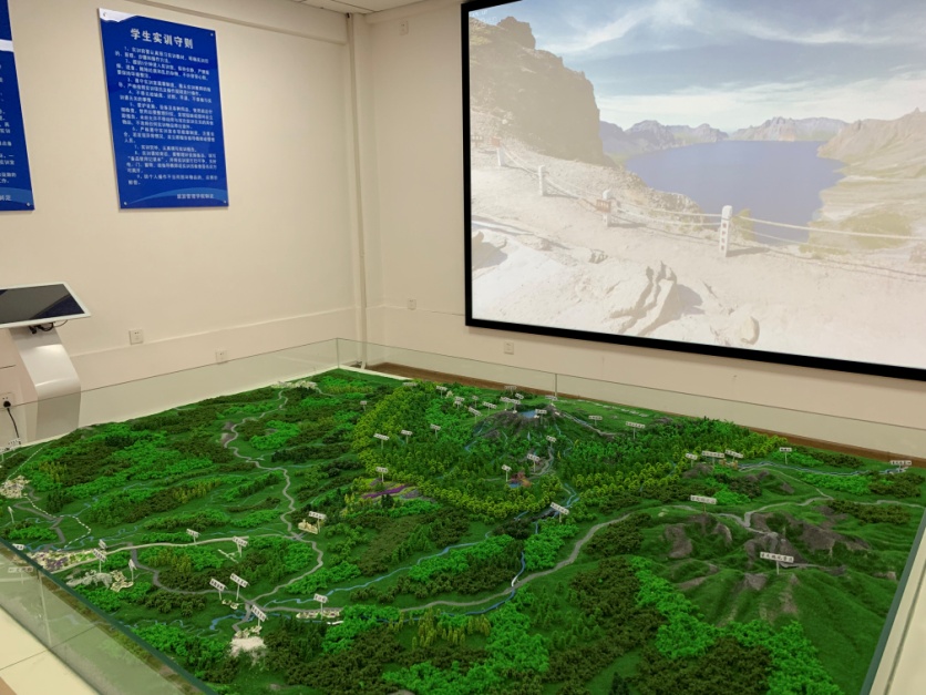 2019年9月长白山电子沙盘实训室建成并投入使用。长白山全景电子沙盘实训室,建筑面积120平方米,可容纳学生35人,为开放式实训室。实训室由塑模实体沙盘,正投与顶投工程投影仪、硬屏、专业解说宣传片、中控系统、投影软件以及触摸一体机组成。本实训室可承担《旅游景区管理》、《中国旅游地理》、《吉林导游》、《景区规划与管理》等课程的实训,实训室全真模拟长白山实地景观和风土人情,打破传统的重理论讲解轻实践实训的教学方式,通过视频和沙盘投影使学生更加直观全面的了解长白山的地形地貌、植被、景点、景区规划等,培养学生掌握长白山景区讲解、服务与接待能力,提高学生服务地方旅游经济的能力。