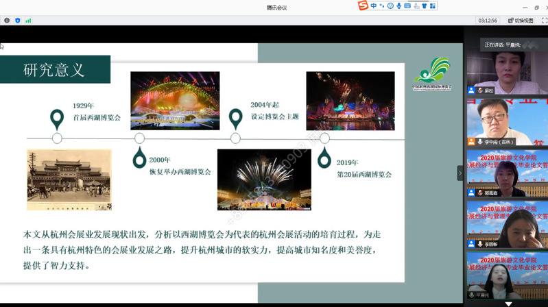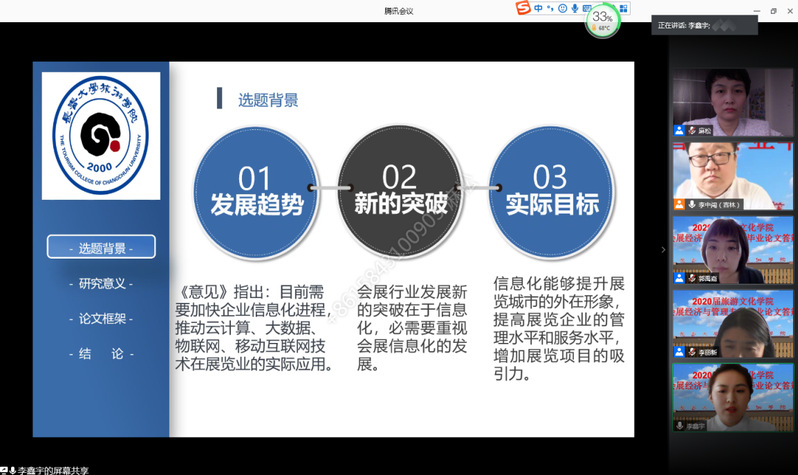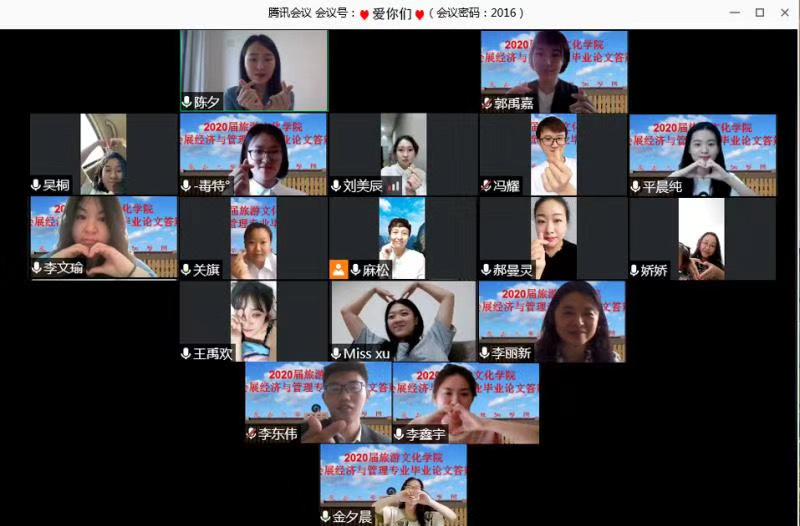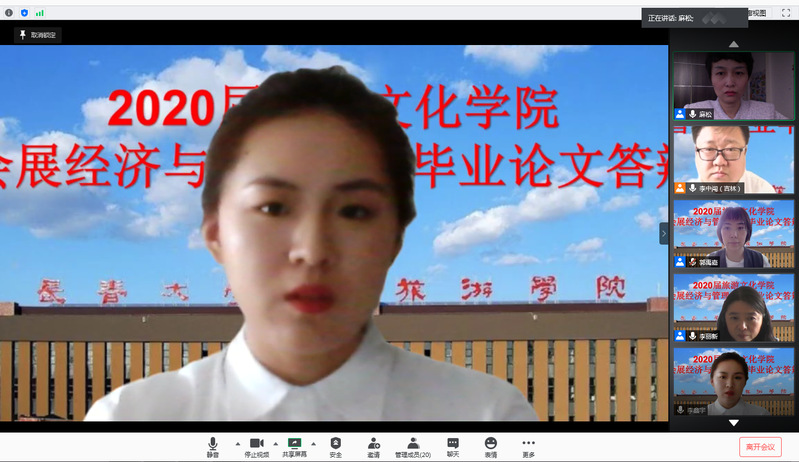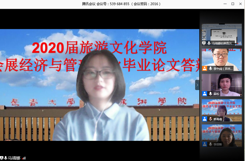 2020年5月31日,旅游文化学院会展经济与管理专业举行了2020届毕业论文线上答辩评审会,答辩组评委由李中闯、李丽新、麻松、郭禹嘉、姜雪五位老师组成,参与答辩的学生为2016级会展经济与管理专业16位准毕业生。