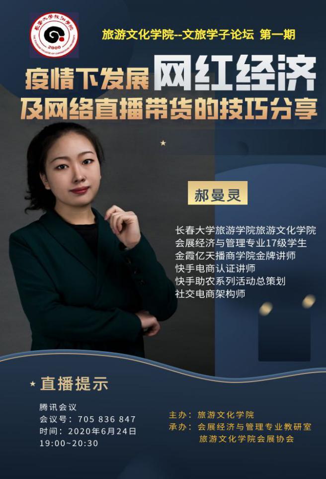 2020年6月24日晚,由旅游文化学院主办;会展经济与管理专业教研室、学院会展协会共同承办的旅游文化学院第一期文旅学子论坛正式启动!本期论坛主讲人为旅游文化学院17级会展经济与管理专业学生郝曼灵;主持人为会展经济与管理专业学科带头人李中闯老师;出席本次论坛的有旅游文化学院院长孙国霞、学院党总支书记姜欣、学院办公室主任王伟光、学院团委书记兼学生办公室主任蒋森以及各专业教师和同学们。