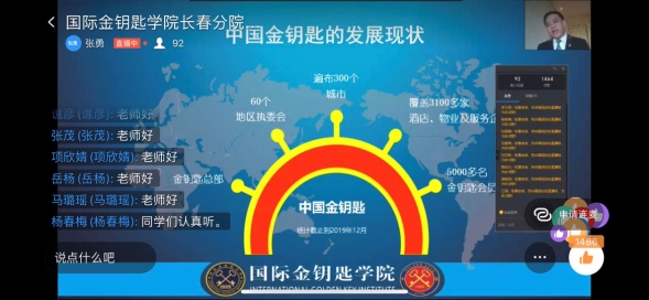 2020年10月4下午,国际金钥匙学院长春分院(旅游文化学院)线上举办酒店管理专业金钥匙方向班介绍会,国际金钥匙学院长春分院、旅游文化学院院长孙国霞在线上介绍会中介绍了我校及我院与国际金钥匙学院在人才培养方面的合作;中国金钥匙副秘书长、国际金钥匙学院(中国区)运营中心运营官张勇先生针对国际金钥匙学院人才培养理念、人才培养模式、课程体系、学生高端就业情况、学生职业发展等相关内容作了近一个小时的线上讲解。
