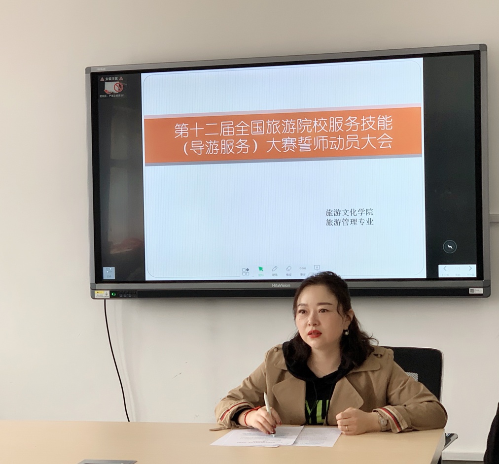 距离第十二届全国旅游院校服务技能(导游服务)大赛还有1个月的时间,为切实做好赛前准备工作,夺取此次大赛的胜利,4月12日下午,旅游文化学院旅游管理专业学科带头人杨絮飞主持召开赛前誓师动员大会。4名参赛选手和各位指导老师参加了此次誓师动员大会。