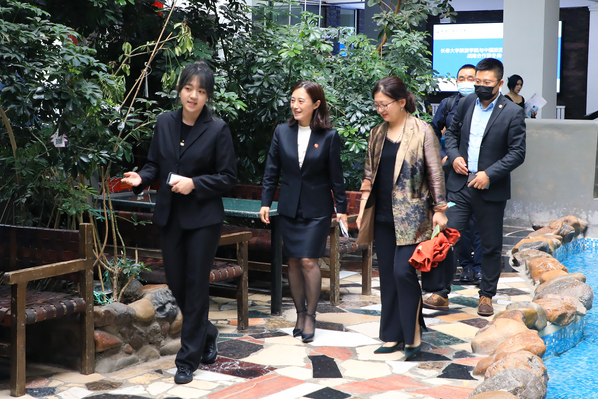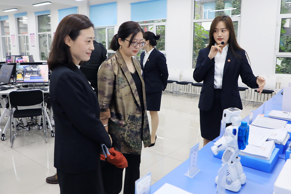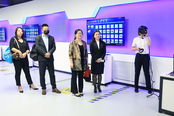 中国旅游集团酒店控股有限公司嘉宾一行参观考察了学校独具特色的天井景观带,在人工智能实训室体验了景区智能语音导引机器人,在VR虚拟仿真实训室体验了VR虚拟模拟导游讲解教学,观摩了大学生创客中心、师生美术设计作品展、文创作品展,系统了解了学校近年来各项事业发展情况和办学特色。