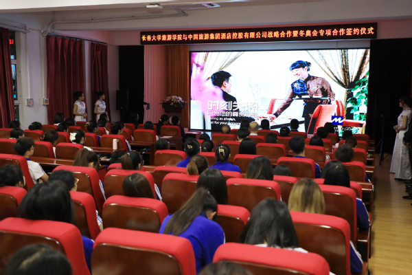在签约仪式现场,与会人员观看了中国旅游集团宣传片、中旅酒店控股有限公司宣传片和学校宣传片后,赵莹与张宇分别致辞。