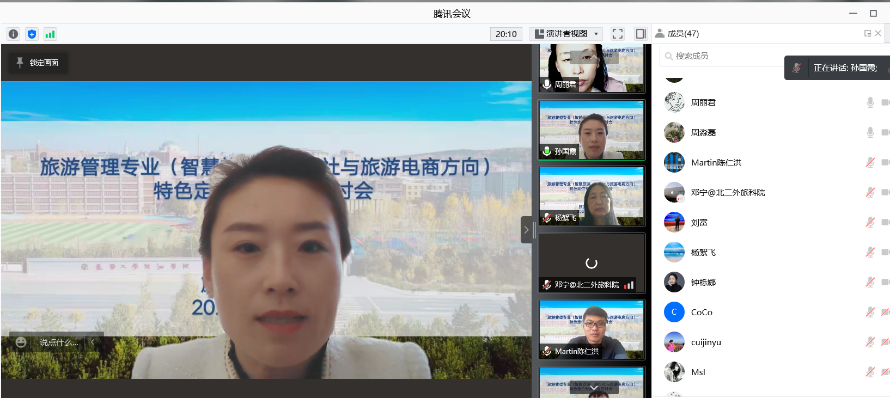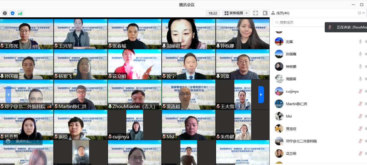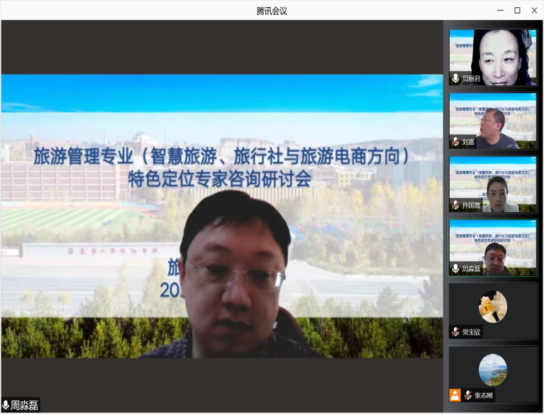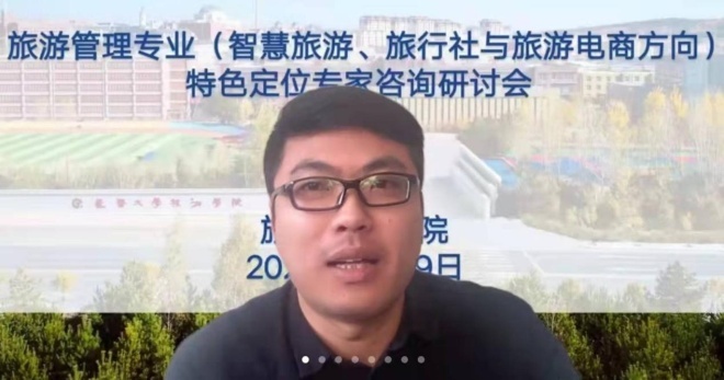 2022年1月19日,旅游管理专业线上进行专业方向改革及一流专业特色建设专家咨询会。会议邀请了北京第二外国语学院中国文化和旅游大数据研究院副院长、文化旅游规划与设计研究院执行院长钟栎娜,北京第二外国语学院旅游科学学院副院长、数字文旅研究中心主任邓宁,携程研究院战略研究中心副主任张致宁,吉林省吉旅大数据产业发展有限公司常务副总陈仁洪,长春文化国际旅行社副总经理崔锦玉,长春大学旅游学院人工智能学院院长、吉林大学博士生导师刘富,长春大学旅游学院特聘专家、吉林大学博士生导师周淼磊参与讨论。旅游文化学院全体教师、人工智能学院全体教师。会议由旅游文化学院周丽君副院长主持。