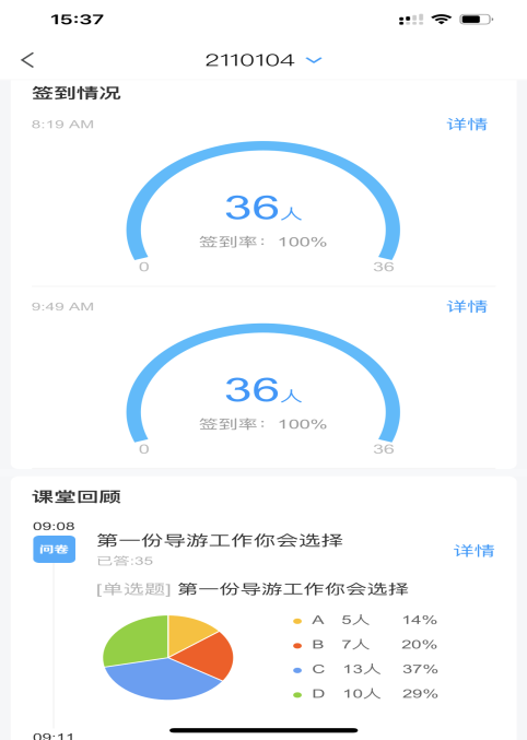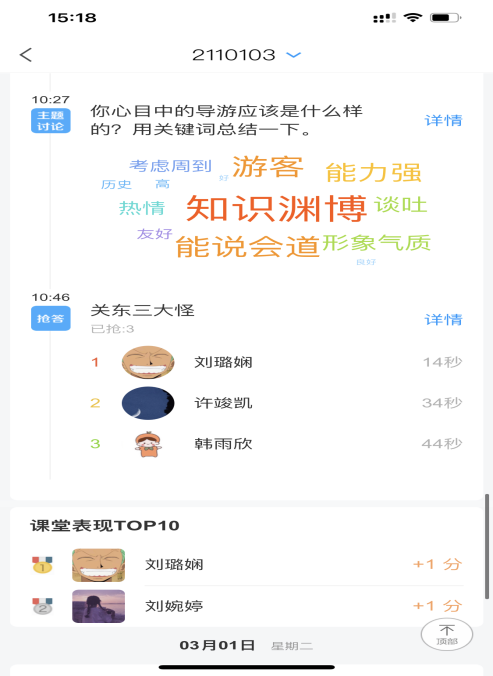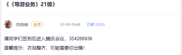 在授课过程中为了保证高质量的授课效果,结合《导游业务》课程特点及现有的丰富线上资源,采用学习通与腾讯会议直播相结合的授课形式,多角度、多层面、多方法、全方位的吸引学生的注意力,努力做到保证高质量教学,学生全员、全程参与课堂,一个都不能少。