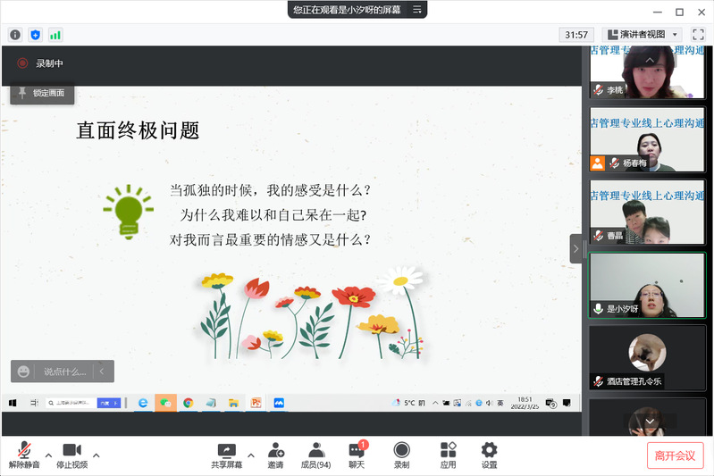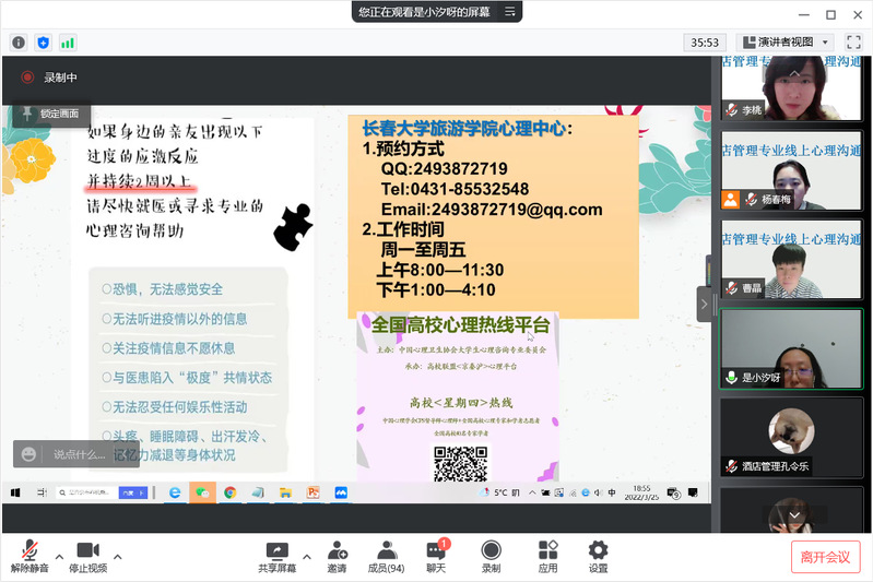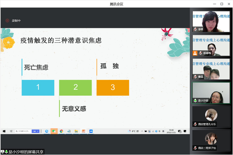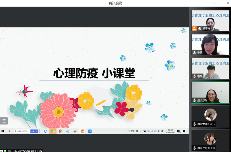 时光飞逝,旅游文化学院遵从学校防疫要求,开展线上教学已经半月有余。为了让学生更好地学习和生活,及时舒缓疫情带来的压力,酒店管理专业在2022年3月25日举行了线上心理沟通会。沟通会特别邀请心理学专业教师岳泉溪老师进行深入浅出的心理学防疫知识讲解。在沟通会开始前,很多同学都表示了期待。