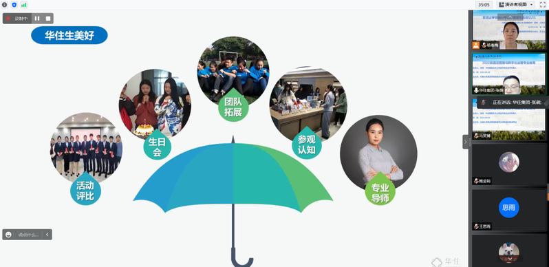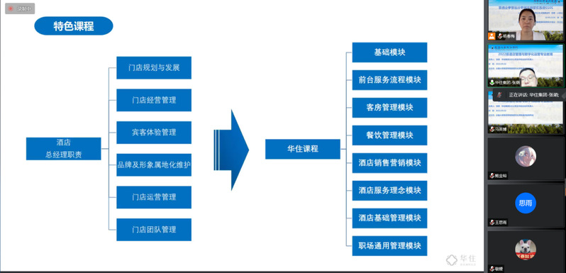 为了更好地引导2022级新生顺利完成角色转换,更快地适应大学生活,了解专业发展,9月2日下午,2022级酒店管理与数字化运营专业在线上进行了新生专业教育,华住集团北方公司合作校企合作负责人张萌,酒店管理专业带头人杨春梅、学院辅导员敬嫒和2022级19名新生线上参会。 会上,华住集团北方公司合作校企合作负责人张萌对华住集团的品牌发展、品牌特点、华住集团在课程支持、职业发展、硬件支持等方面做了详细说明。