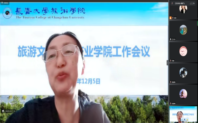 旅游管理专业带头人杨絮飞总结了长白山产业学院工作,在课程建设与人才培养方面,与企业进行关于《冰雪旅游文化》《景区管理》等课程建设的方案研讨,研究由企业人员参与课程建设,承担课程部分实践教学部分。与企业召开关于冰雪实习的研讨,讨论2020级冰雪实习的具体方案落实,并邀请长白山集团嘉宾进行线上专题讲座;与企业开展校企合作共研教科研项目,联合申报吉林省教育厅产教协同育人项目5项,包括师资培训项目、实践条件和实践基地建设项目、新文科建设项目、教学内容和课程体系改革项目4种类型。拟于12月末去长白山集团深入调研,与长白山集团商议关于人才培养方案调整及教师入企挂职锻炼事宜,希望通过深入交流 合作提升人才培养质量,服务地方经济,促进学生留省就业。