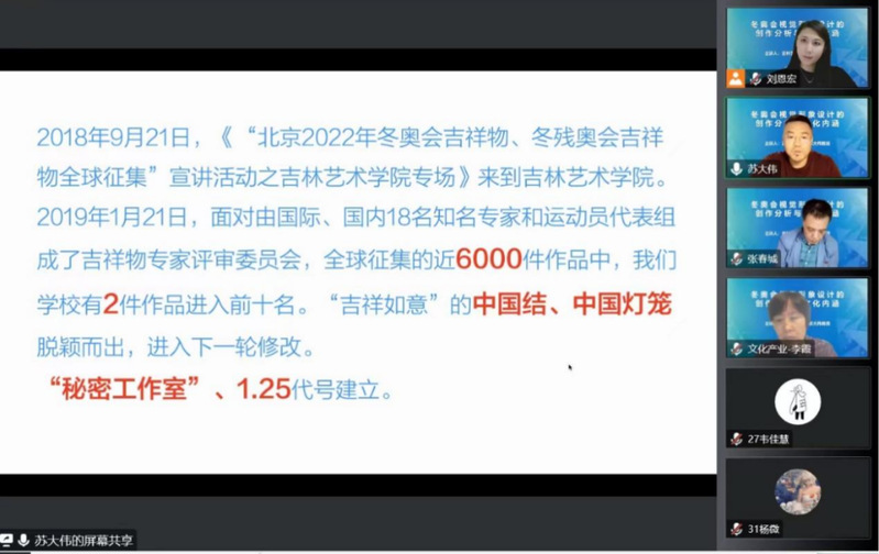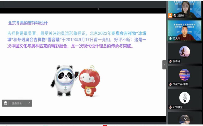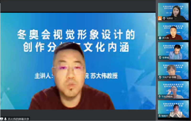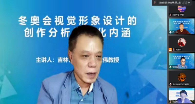 为进一步拓展专业视野,提高师生与专业前沿领域的衔接,理解文创产品设计的文化内涵,12月8日晚,旅游文化学院文化产业管理专业邀请了吉林艺术学院艺术学博士、吉林省创意产业协会执行会长、吉林省国际创意产业研究中心主任、冬奥会吉祥物“雪融容”设计团队的苏大伟教授,举办了以“中国文化、世界风采”为主题的线上讲座活动。旅游文化学院院长孙国霞、文化产业管理及相关专业师生在线聆听了此次讲座,讲座由专业带头人张春城主持。