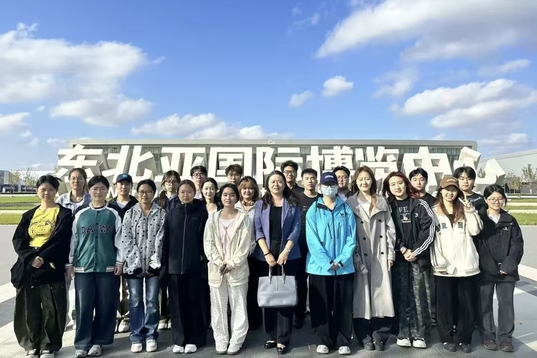 李老师与2023级会展经济与管理专业学生在东北亚国际博览中心合影
