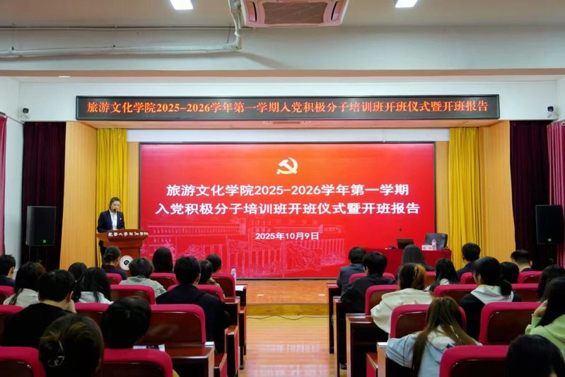 为深入贯彻落实新时代党的建设总要求和新时代党的组织路线,严格党员发展程序、保证发展党员质量,加强入党积极分子的思想教育和党性锤炼,为党组织培养输送高素质后备力量,10月9日,旅游文化学院党总支在筑梦报告厅举行2025-2026学年第一学期入党积极分子培训班开班仪式暨开班报告。马克思主义学院直属党支部副书记魏娇、学院党总支副书记张锦华、全体辅导员及全体学员参加。开班仪式由学院党总支组织员敬嫒主持。