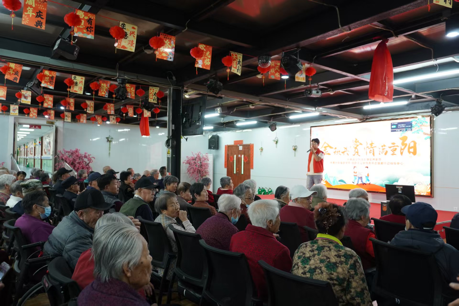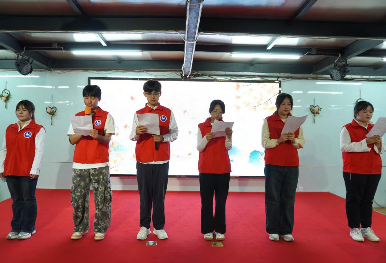 文艺演出环节并非单纯的节目呈现,而是一场跨越年龄的情感对话。2025级学生张涵的民族舞串烧,以灵动舞姿诠释传统美学,让长者感受文化活力;2024级学生袁国涛献唱的《当你老了》《可可托海的牧羊人》,用温情旋律叩击心灵,将对长辈的敬意融入歌声;全体志愿者齐唱的《光阴的故事》,则以熟悉的旋律唤醒长者的青春记忆,不少老人轻声跟唱,眼角的笑意与歌声交织成 “代际共融” 的动人图景。受现场氛围感染,多位长者主动登台展示才艺——或演唱经典老歌,或讲述岁月故事,双向的情感传递让志愿服务从“单向付出”变为“双向温暖”,彰显了“尊重长者、倾听长者”的人文理念。最后,志愿者集体朗诵《重阳颂》,以文字为媒致敬岁月、礼赞敬老传统,让节日的文化意蕴在声韵中落地生根。